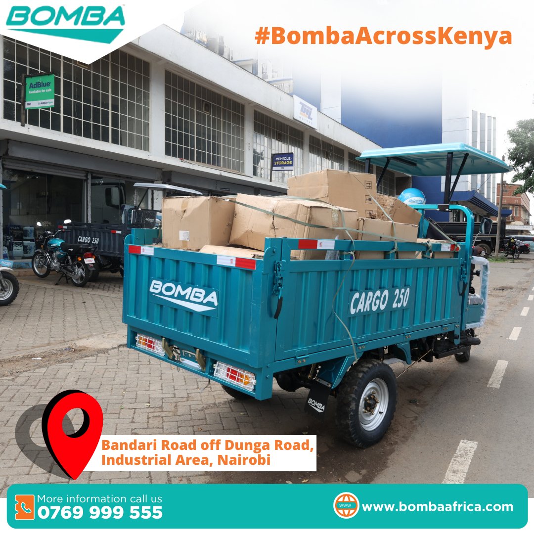 #BombaAcrossKenya Tupate at our main branch at TNL Center, Bandari Road, off Dunga Road, Industrial Area, Nairobi, for a wide selection of Bomba cargo tuk-tuks. Wasiliana nasi leo! ☎Call: 0769 999 555 📱Whatsapp: tinyurl.com/Bomba-Africa #cargotuktuk #tuktukforsale
