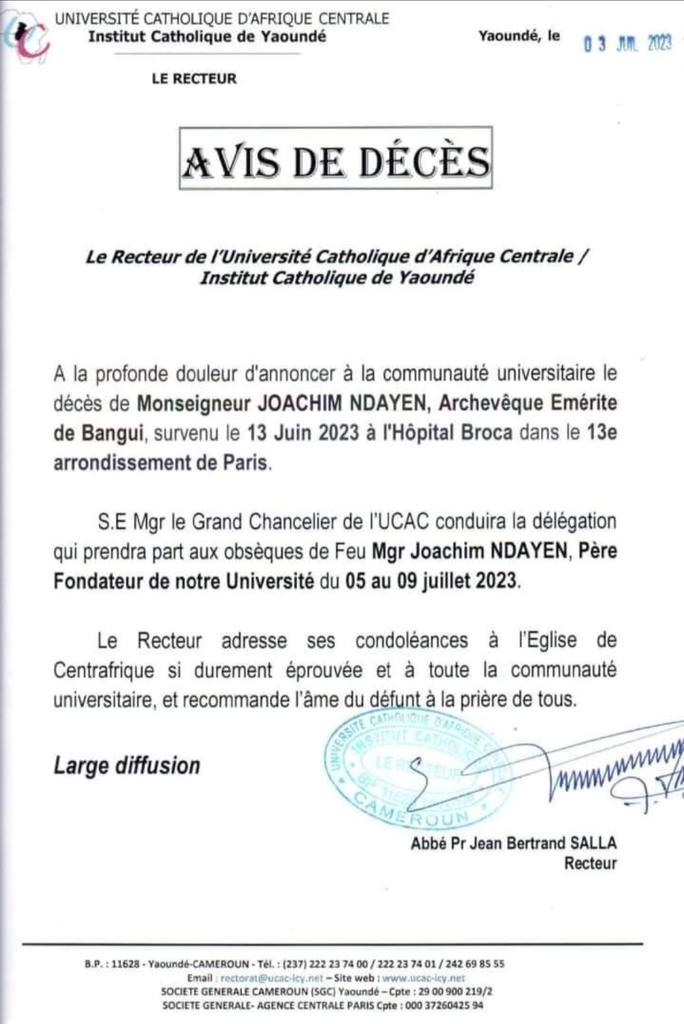 Le Grand Chancelier de l'Université Catholique d'Afrique Centrale prendra part aux obsèques de Mgr Joachim Ndayen, Père fondateur de l'UCAC. Il interviendra pour présenter le rôle et la place de #Ndayen dans la formation de l'intelligentsia en Afrique Centrale.#UCAC @IsaacUcac
