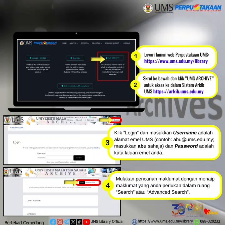 📲Jom terokai pelbagai koleksi Arkib UMS melalui Laman Web Perpustakaan! 🌐 ums.edu.my/library 🌐 arkib.ums.edu.my Selamat meneroka!😁 #UMSArchive #TingkatkanPengetahuan #PerkongsianMaklumat #PerpustakaanUMS #UMStheBrainofBorneo