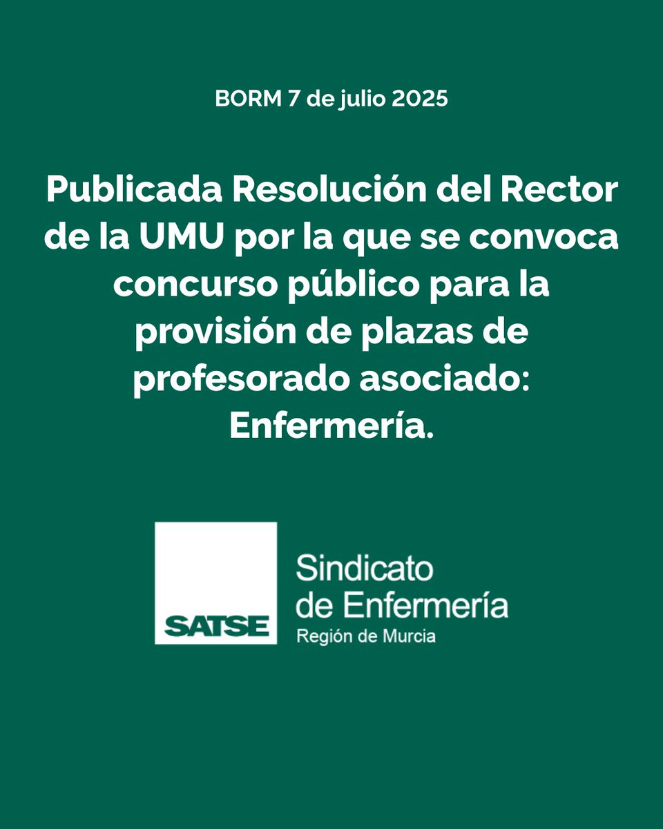 👁🗨Resolución del Rector de la Universidad de Murcia (R-921/2025) de 3 de julio, por la que se convoca concurso público para la provisión de plazas de profesorado asociado, Enfermería 👇 murcia.satse.es/documents/d/re… #BORM #UMU #Enfermería #SATSE