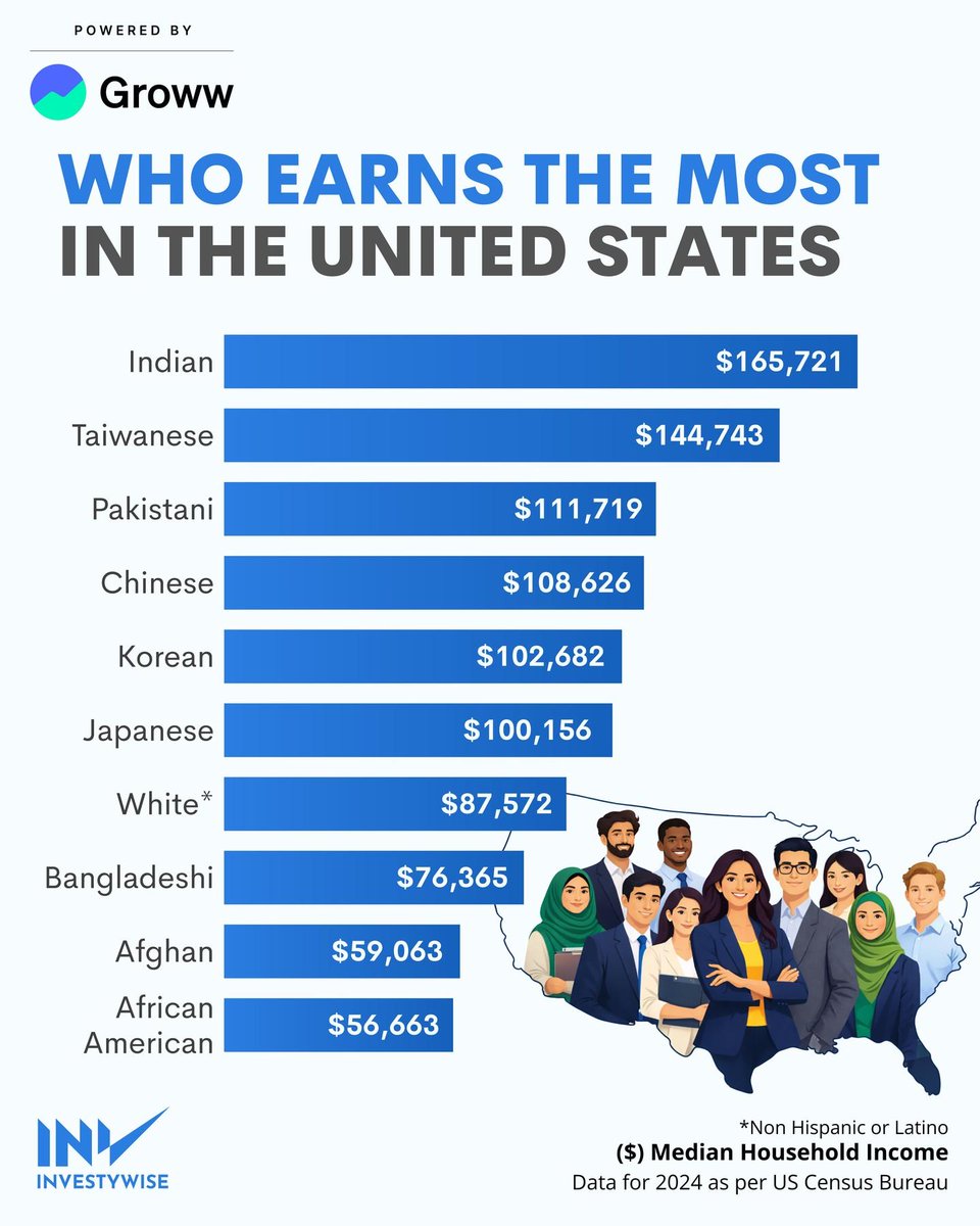 Indian households had the highest median income in the United States at $165,721, followed by Taiwanese at $144,743, per 2024 US Census Bureau data. #MedianIncome #USCensus #HouseholdIncome #EconomicData #IncomeStatistics