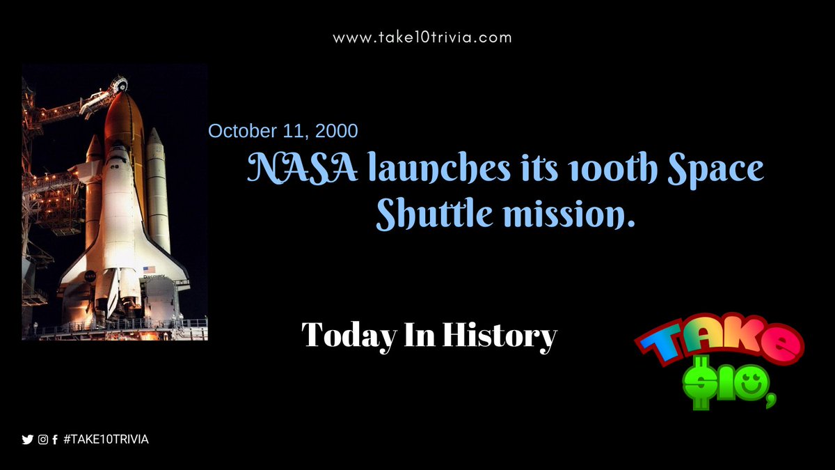 October 11, 2000 NASA launches its 100th Space Shuttle mission. #USsatellite #Explorer #first #video #pictures #earth #news #take10trivia #didyouknow #history #satellite #space #rocket #today #world #us #people #thankyou #unitedstates #usa #canada #Space #Shuttle #mission #NASA