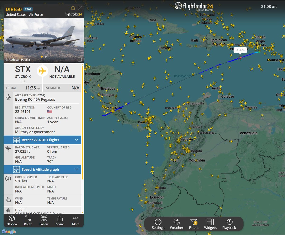 YARN50 y 51: x2 KC-46A (21-46097 y 22-46101) Pegasus desde St. Croix🇻🇮 haciendo reabastecimiento en vuelo dentro del FIR Maiquetía🇻🇪 No es un entrenamiento, parece una nueva demostración de fuerza🙄, la primera desde el 3 de enero.. #USVI #Venezuela #SOUTHCOM #OpSouthernSpear