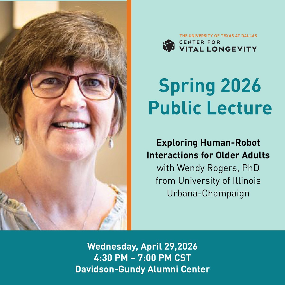 Our Spring Lecture is coming up this week with Dr. Wendy Rogers! Learn how robots are being designed to better support older adults and how thoughtful, human-centered design can improve everyday life. Book your seat now: tinyurl.com/4jby569x #CVL #UTDallas #SpringLecture