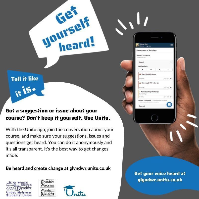 Unitu is where students, staff and course reps can collectively discuss academic or general issues during your time here at Glyndwr. Whether it's to give praise, ask questions or give feedback, Unitu is the place to do it! #unitu #studentvoice #studentvoiceplatform #glyndwr