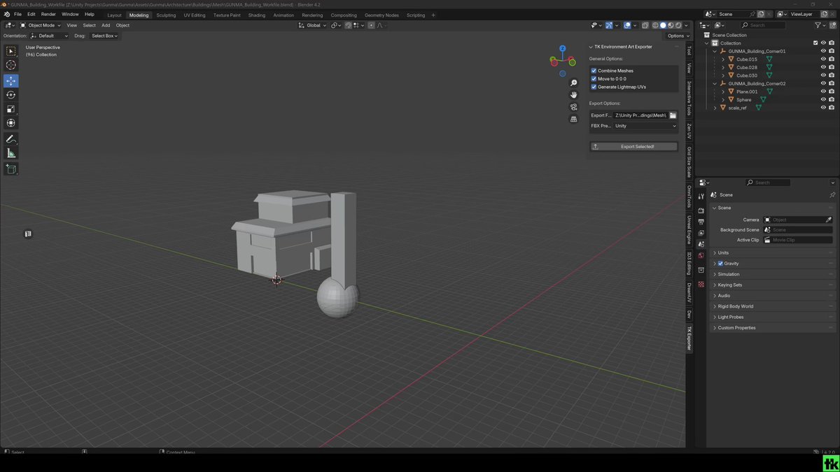 💾Sneak peek of my #Blender addon TK Environment Art Exporter! ✅Created with modular workflows in mind ✅Merge children and rename with SM_ prefix (great for Unity) ✅Clean auto lightmap UVs (optional) ✅FBX presets for #UnityEngine#UnrealEngine Beta version soon!