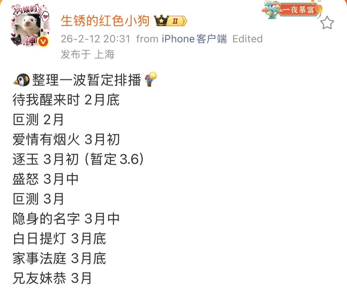 🍉Upcoming dramas in February to March 2026 Tencent Video 🐧 #ComingToMyself #Unpredictable #LoveHasFireworks #ChasingJade (03.06) +🥝 #ShengNu #VanishedName +CCTV🐑 #LoveBeyondTheGrave #FamilyCourt +🥝, CCTV🐑 #RomanceNextDoor iQIYI🥝 #TheDevilBetweenUs (02.27)