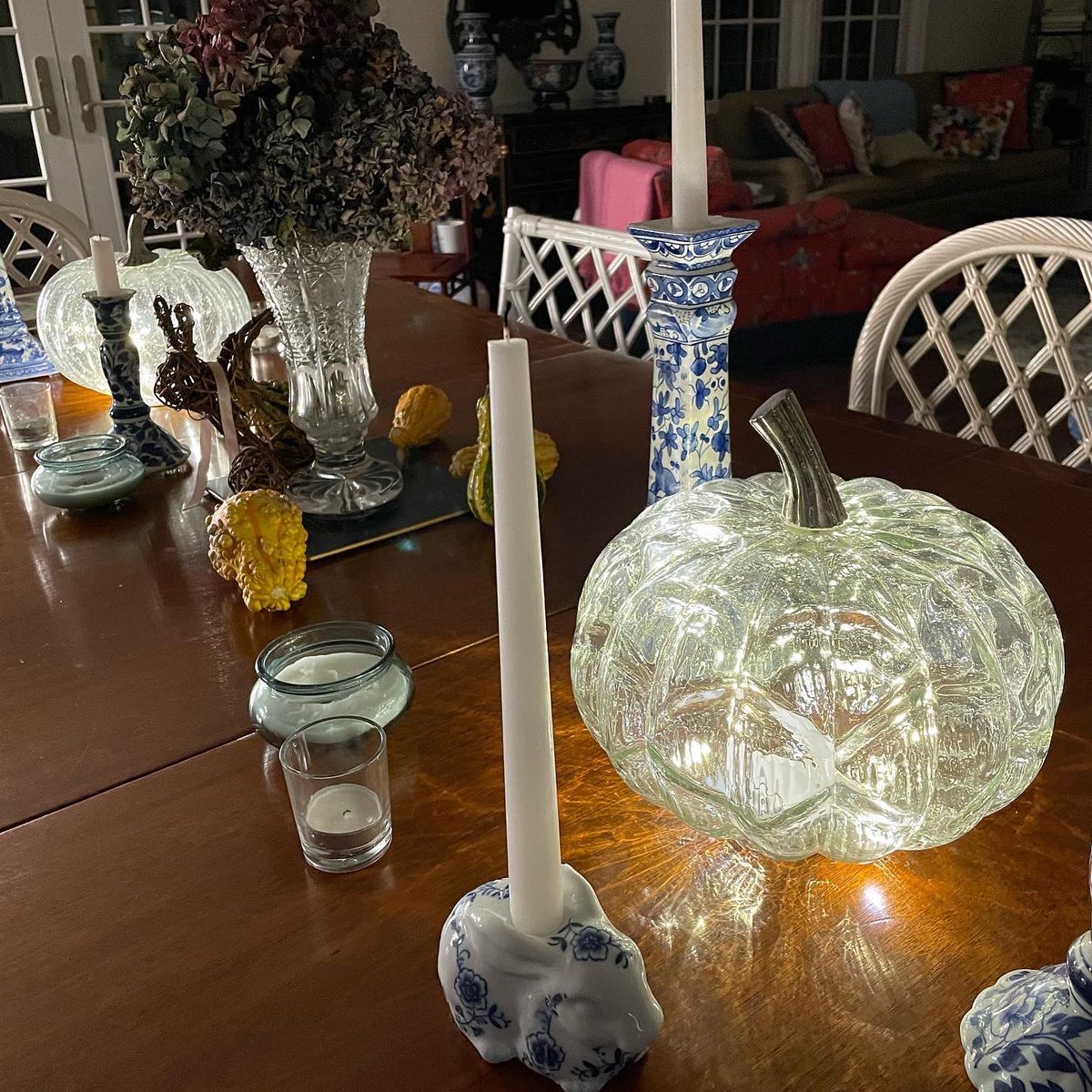 Pumpkins come in all shapes and sizes Normally, I’m a fan of quirky gourds. But these glass pumpkins w LED fairy lights remind me of Cinderella. Love this new look! @abc7ny #tablescape #usethegoodstuff #candles