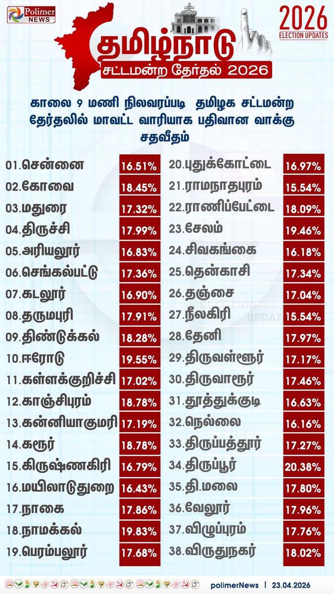 #ELECTIONUPDATE || மாலை 6 மணி - மாவட்ட வாரியாக வாக்குப்பதிவு | #Percentage | #Vote | #Celebrities | #ChiefElectoralOfficer | #TNElection2026 | #TNElection | #Election2026 | #TNAssemblyElection2026 | #PolimerNews