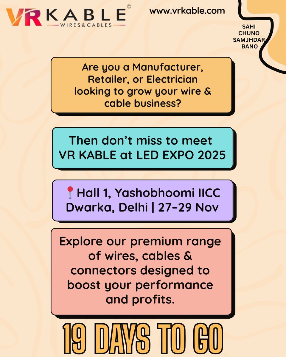 Only 19 days to go for #LEDExpo2025 🎉 Get ready to explore VR KABLE’s premium wires, cables & connectors — made for manufacturers, retailers & electricians who believe in quality & innovation 📍 Yashobhoomi Dwarka | 📅 27–29 Nov #Vrkable #LatestUpdates #Delhi #BusinessSuccess