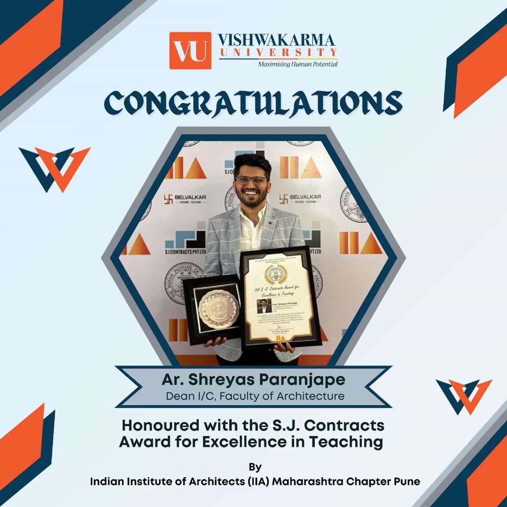 Our very own Ar. Shreyas Paranjape, Dean I/C of the Faculty of Architecture, has been honoured with the prestigious S.J. Contracts Award for Excellence in Teaching by the Indian Institute of Architects (IIA) Maharashtra Chapter Pune centre. #Award #Architecture #vuarchitecture