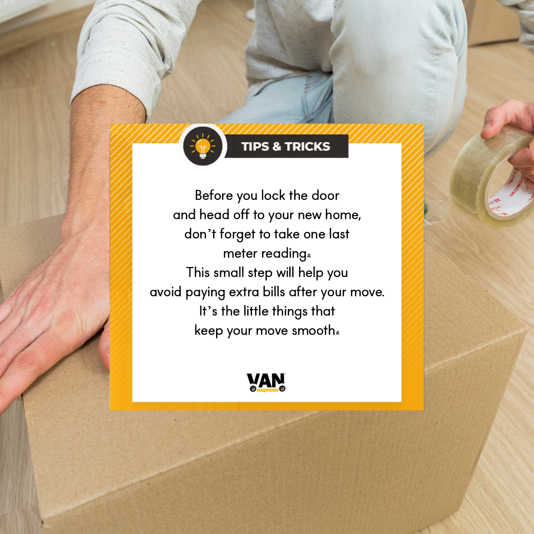 Before you lock the door and head off to your new home, don’t forget to take one last meter reading! This small step will help you avoid paying extra bills after your move. It’s the little things that keep your move smooth! #MovingMadeEasy #SmartMoving #VanExpress