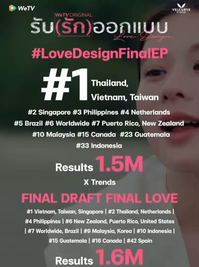 ขอบคุณพลังสนับสนุนอันแข็งแกร่งของทุกคน 🫶🏻 พลังของแฟนๆ ทำให้ #LoveDesignFinalEP FINAL DRAFT FINAL LOVE พุ่งทะยาน ถึง 1.5M และ 1.6M บน X Trends 💝 ขอบคุณที่ร่วมสร้างปรากฏการณ์ รับ รักออกแบบ ไปด้วยกัน 📝💕 #VelCurveStudio #LoveDesignSeries #เก้าเจนเจนเก้า #KaoJaneJaneKao