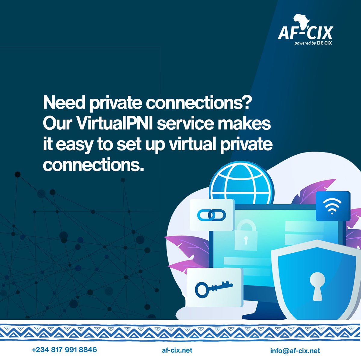 Need private connections? Our VirtualPNI service makes it easy to set up virtual private connections within and between metro regions. Save on costs and extend your network reach effortlessly. Learn more>> af-cix.net/en/services/vi… #Privateconnections #virtualvpn #afcix