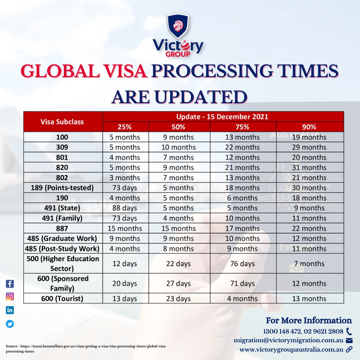 Global Visa processing times will be updated monthly DHA will display four processing times in calendar days to show how long it is taking to finalize 25, 50, 75, and 90 percent of applicants submitted globally #visaprocessingtime #Visa