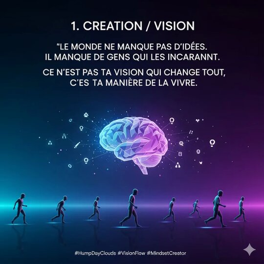 🌐 1. Création / Vision > Le monde ne manque pas d’idées. Il manque de gens qui les incarnent. Ce n’est pas ta vision qui change tout, c’est ta manière de la vivre. #HumpDayClouds #VisionFlow #MindsetCreator