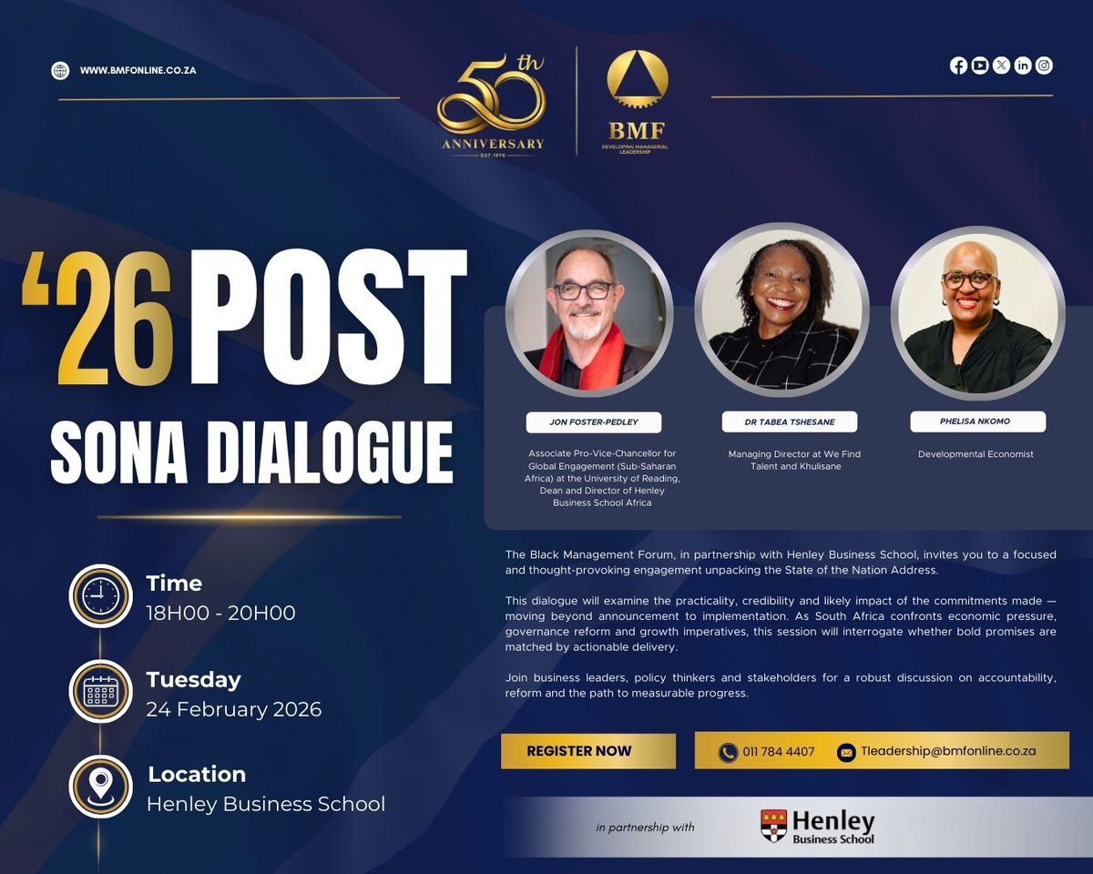 The Black Management Forum invites you to a powerful hybrid Post-SONA Dialogue unpacking the real implications of the 2026 State of the Nation Address. Join us in person or virtually: henleysa.zoom.us/webinar/regist… #BMFPostSONA #TransformationJourney #VisionaryLeadership #BMF50