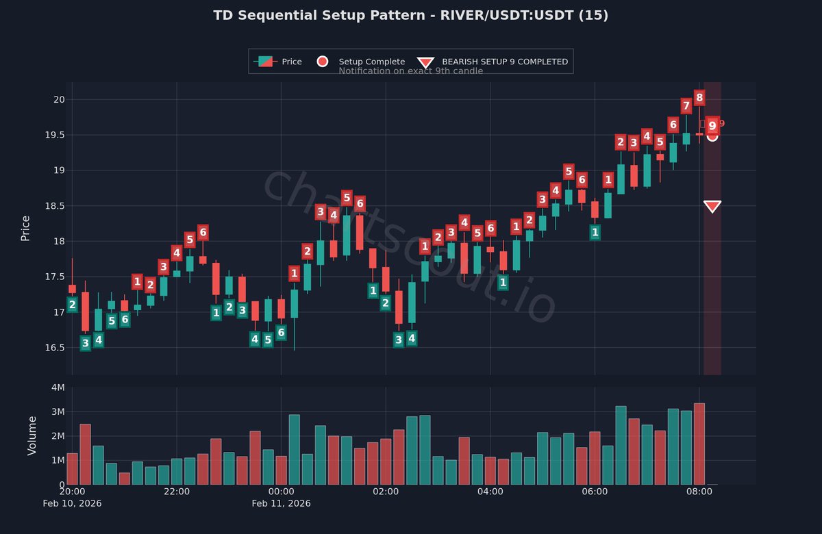 📊 9 consecutive candles—exhaustion likely on TD Setup $RIVER | 15m | Bybit Nine consecutive candles suggests the current trend is running out of steam. #CryptoTA #VolatilityAlert