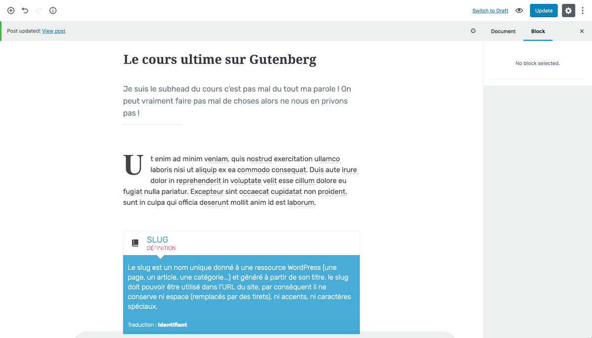 Avec #gutenberg j'ai presque honte d'avoir osé employer le terme #WYSIWYG pour tinyMCE à l'époque. Voici un block qui permet de chercher une définition (CPT) et l'affiche, le tout via la #WPrestAPI
