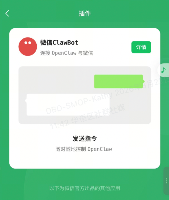 微信刚刚上线ClawBot插件,可以直接接入OpenClaw了! 扫个码或者复制条命令,OpenClaw就能进你微信 以后不用来回切网页,AI直接住进聊天框里 工具变助手,入口直接变日常,大家准备开用了吗? #OpenClaw #WeChat #ClawBot