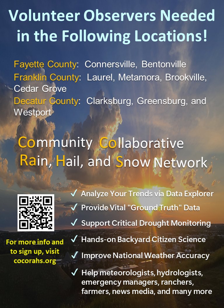 📢 Volunteers Needed! @CoCoRaHS is looking for weather observers in Fayette, Franklin, and Decatur Counties, IN. ⛈️ ❄️ Help meteorologists with vital "ground truth" data from your own backyard. Sign up today: 👉 cocorahs.org #INwx #CitizenScience #Weather #Indiana