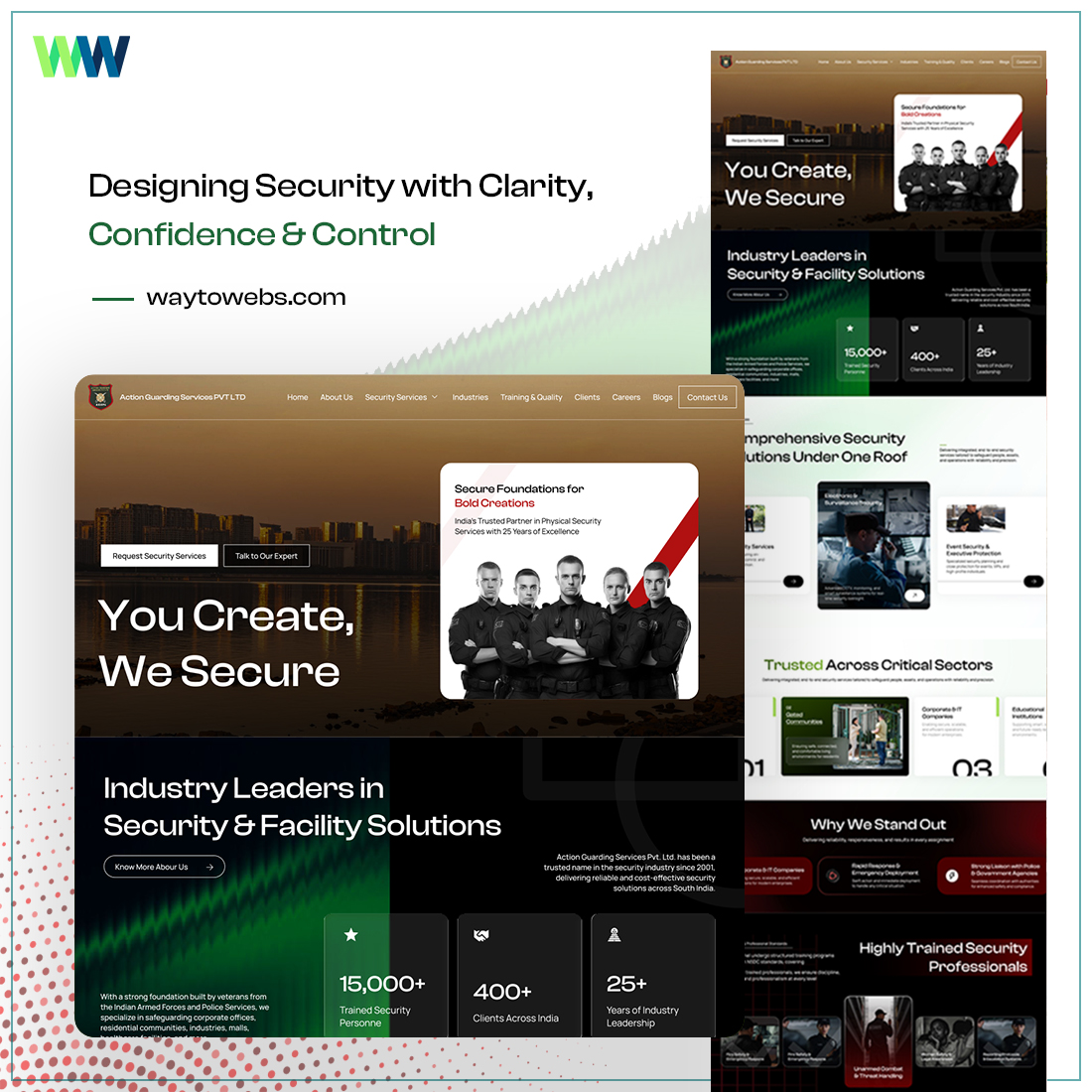 Designing Security with Clarity, Confidence & Control. Design Approach: Secure • Professional • Clean • Structured #ActionGuardingServices #SecurityServices #WebsiteDesign #UIUXDesign #DesignShowcase #Waytowebs waytowebs.com share.google/bHtY8SJ5SS041J…