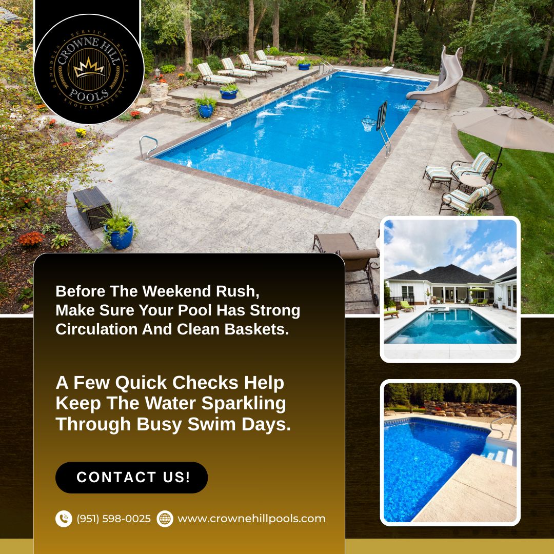Make your pool weekend-ready with better circulation and quick debris checks. Simple steps go a long way. #CrowneHillPools #WeekendPoolPrep #TemeculaPools #ClearWaterTips #PoolCareExperts