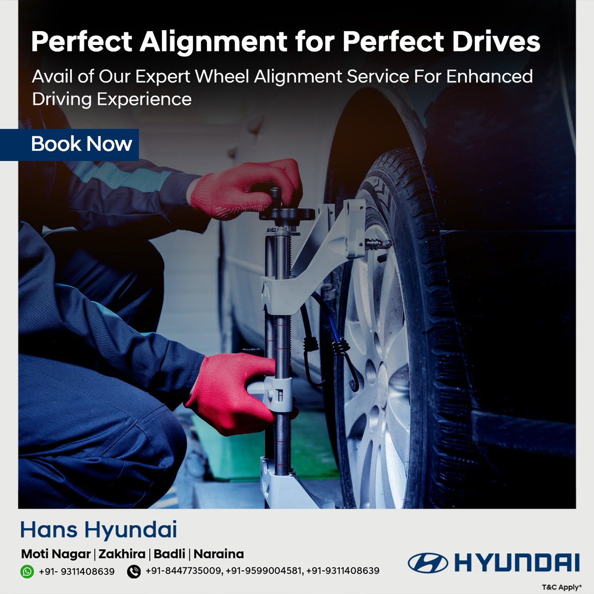 Keep your #Hyundai running smooth and straight with expert #wheelalignmentservice at #HansHyundai. #Drivesafe, #drivesmart! Book now: bit.ly/Hyundai_CarSer… #HansHyundai 📍 Moti Nagar & Zakhira: +91 84477-35009 📍 Badli: +91 9599004581 📍 Nariana: +91 9311408639 *T&C apply