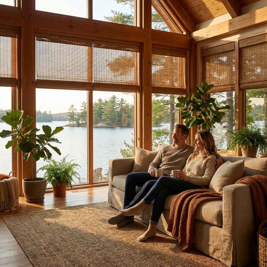 Smart blinds, serene views. Enjoy privacy and comfort at the touch of a button—no strings attached. Experience Muskoka living with style and ease. See how: masonside.com #MuskokaHomes #WindowDesign
