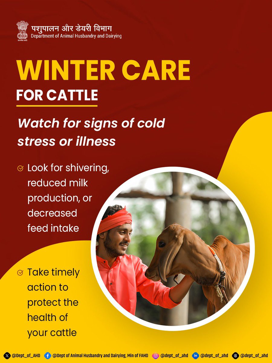Early detection of cold stress can prevent serious health issues in your cattle. Monitoring signs such as shivering, reduced milk yield, or lower feed intake ensures timely intervention. #WinterCareForCattle #WinterAlert #Cattle