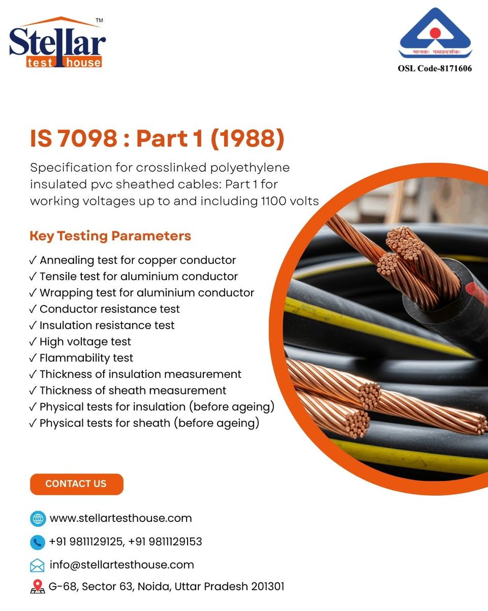 IS 7098 : Part 1 (1988) Specification for crosslinked polyethylene insulated pvc sheathed cables: Part 1 for working voltages up to and including 1100 volts 📞 9811129125, 9811129153 🌐 stellartesthouse.com #IS7098 #XLPECable #CableTesting #ElectricalTesting