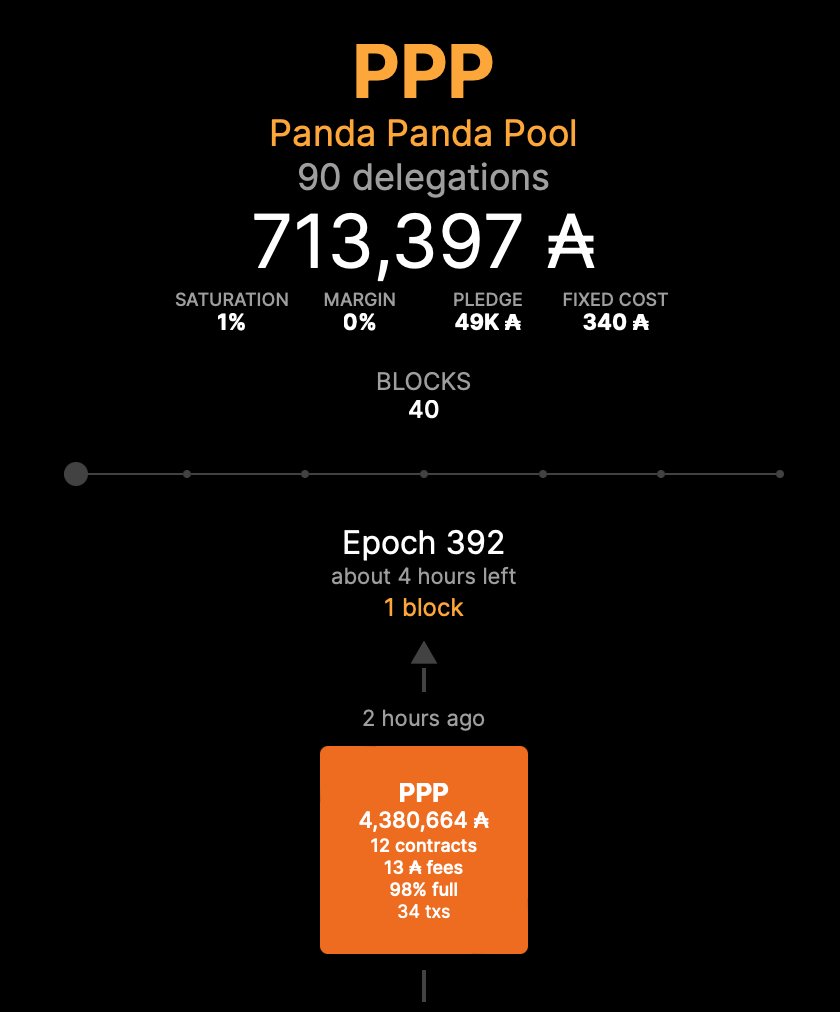 HEY PPP FAMILY 🐼 WE JUST MINTED ANOTHER BLOCK! THAT MAKES IT 2 FOR THIS EPOCH 🥳🧱 and we are always looking for new members to join our #ADApool 🌱 Ticker PPP Margin 0% Fixed fees 340 ₳ #Cardano #ADA #StakingRewards #CardanoCommunity