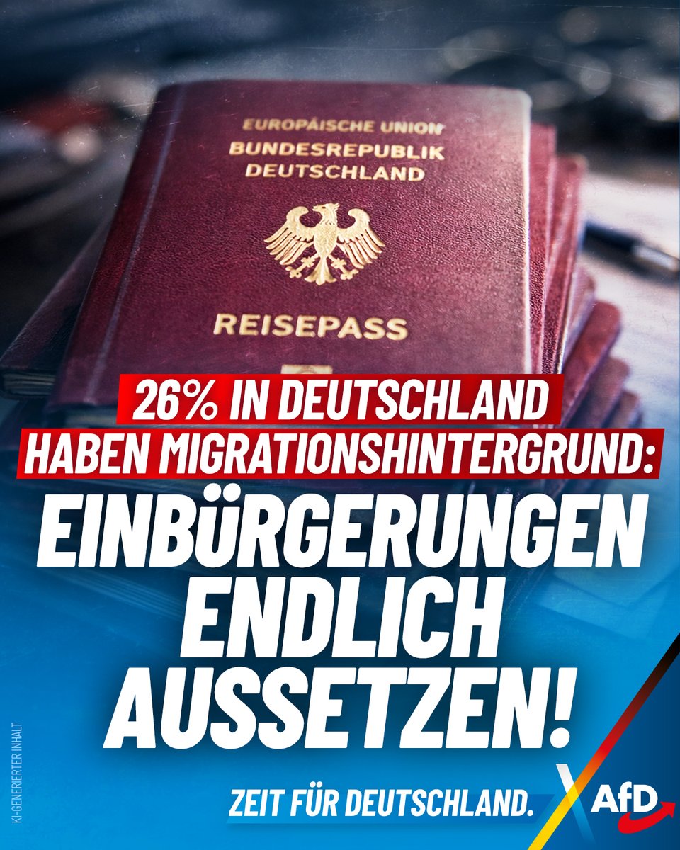 Während die Bevölkerung schrumpft, wird die demografische Veränderung durch Masseneinwanderung beschleunigt. Wir fordern den Stopp der Einbürgerungen, vor allem für Syrer. Sicherheit und Wohlstand unserer Bürger müssen endlich wieder Priorität haben.