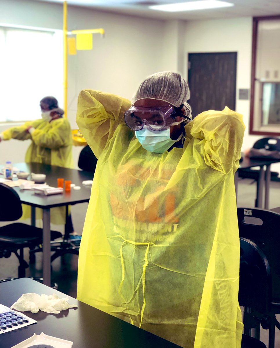 Aldine ISD high school students practice putting on personal protective equipment before creating placebo gel capsules during the Be A Health Hero Summer Camp at @BlansonCTEHS. #healthscience #AISDSUMMERCAMP