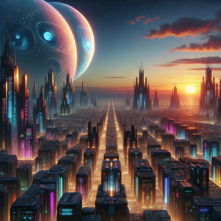 Discover the wonders of an alien metropolis at dusk in our 'Alien Cityscape' series 🌆👽. Marvel at the gravity-defying architecture, neon-lit streets, and the vibrant dance of colors reflected by two suns setting. #AlienArchitecture #CosmicDusk