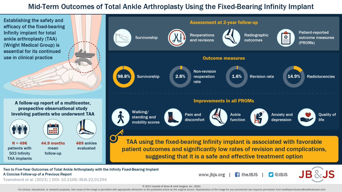 2 year survivorship from @NorthernFeet show that Total Ankle Arthroplasty #TAA has >98% surviviorship. Older patients with better improvement in Outcomes Scores. Article in the latest @jbjs issue. #AnkleArthritis @Str8bonesJim @BostonFootAnkle @gwstewart1 Thoughts?