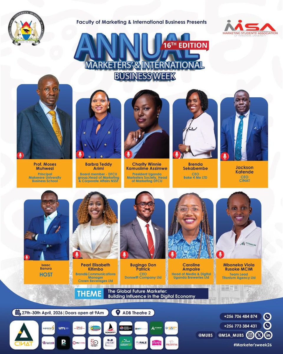The 16th #Annual Marketers’ & International Business Week is here! Meet the CEOs, brand bosses, and marketing minds running Uganda’s biggest companies. 📍 ADB Theatre 2, MUBS 📅 27-30 April 26 | 9AM Daily @dfcugroup . @nssfug @UgandaBreweries . @crown_beverages