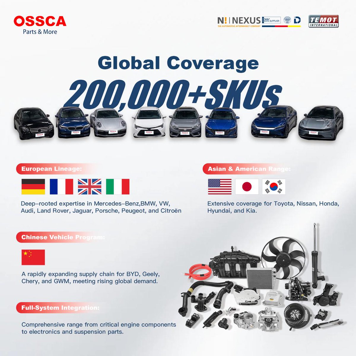 200,000+ SKUs drive OSSCA’s global reach 📦🌎 Your one-stop automotive aftermarket solution. Covering European, Asian, American & Chinese vehicle lines. Full-system parts: engine, electronics, suspension & more ⚙️ 30 years of expertise for global auto demands. #OSSCA #AutoParts