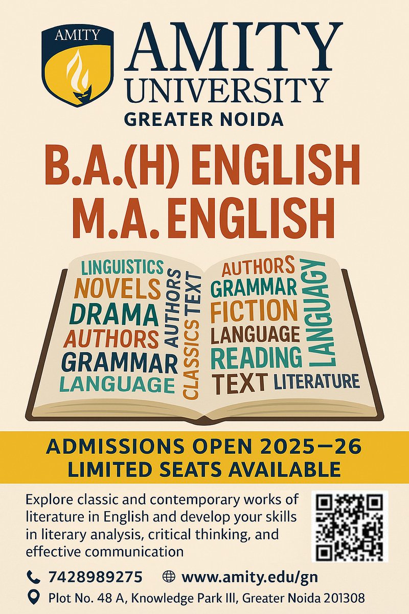 ✨ Explore the Power of Words ✨ Admissions Open for BA (H) English & MA English at Amity University Greater Noida! 📍 Apply Now and Craft Your Story with Us! 📞 7428989275 🌐 amity.edu/gn #AdmissionsOpen #BAEnglish #MAEnglish #AmityUniversity #AmityGreaterNoida