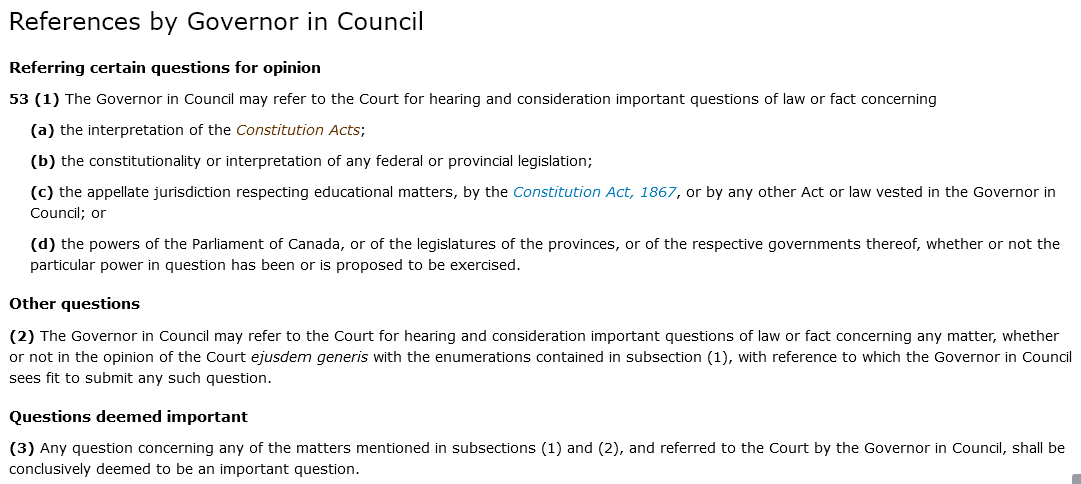The Governor General in Council has the authority to refer questions on constitutionality of provincial legislation to Supreme Court Canada under Supreme Court Act s53.1(b). See also s53.2 to refer any other questions. Text canlii.org/en/ca/laws/sta… #scc #constitution #bil21