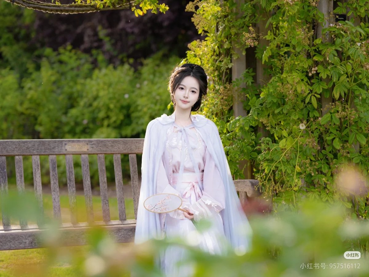 A girl in light pink #Song Dynasty style open-front outerwear, white waist-high #skirt & sheer Hanfu cloak stands among #blossoms, adding Eastern charm to the English #garden. #Hanfu #Song Dynasty styleHanfu#londonflowerseas #chineseculture(via:Wanwan)
