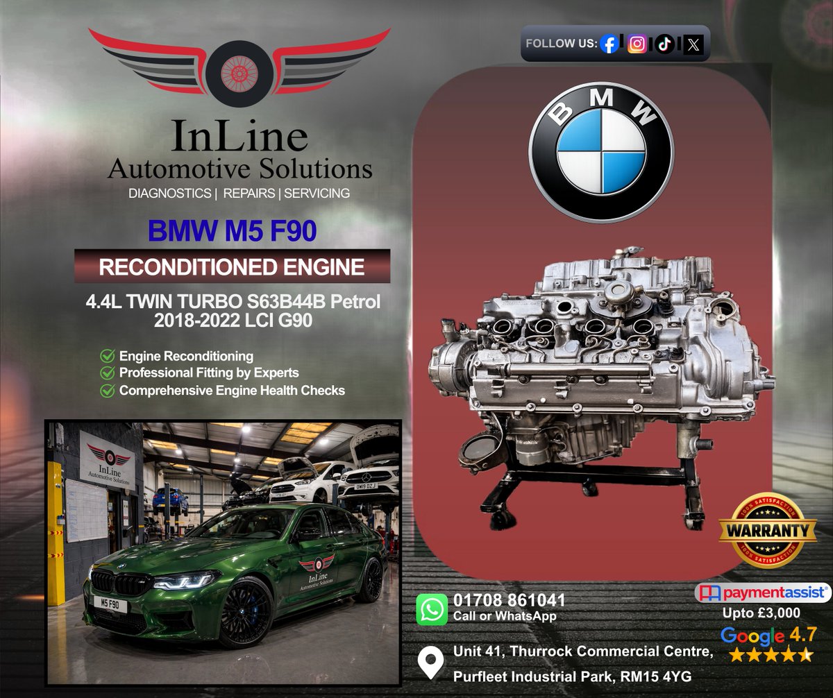 BMW M5 F90 S63TU Engine Rebuild Fully reconditioned 4.4L V8 – built for performance & reliability ✔ 12-month warranty ✔ Supply & fit available £10,895 📲 01708 861041 (WhatsApp your REG) #BMWM5 #F90 #S63TU #EngineRebuild #CarRepair #Essex #London #Kent #BMWSpecialist