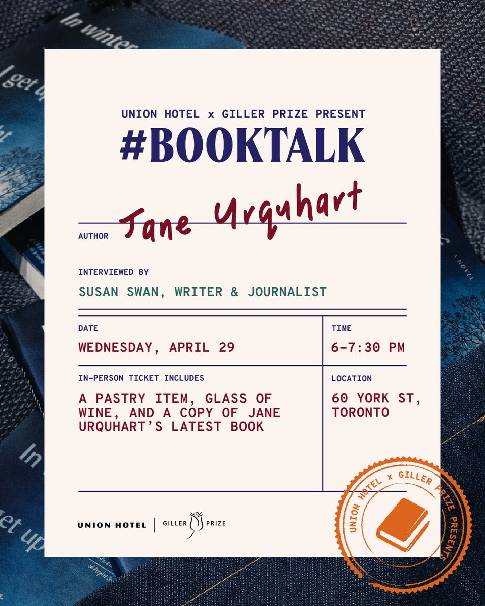 Hey, Toronto #booklovers! Limited spots remain for #BookTalk with Jane Urquhart & @swanscribe at Union Hotel. Join us on April 29 at 6 p.m. Your ticket includes: 🥐 A pastry item 🍷 A glass of wine 📖 A copy of IN WINTER WE GET UP AT NIGHT & the opportunity to have it signed