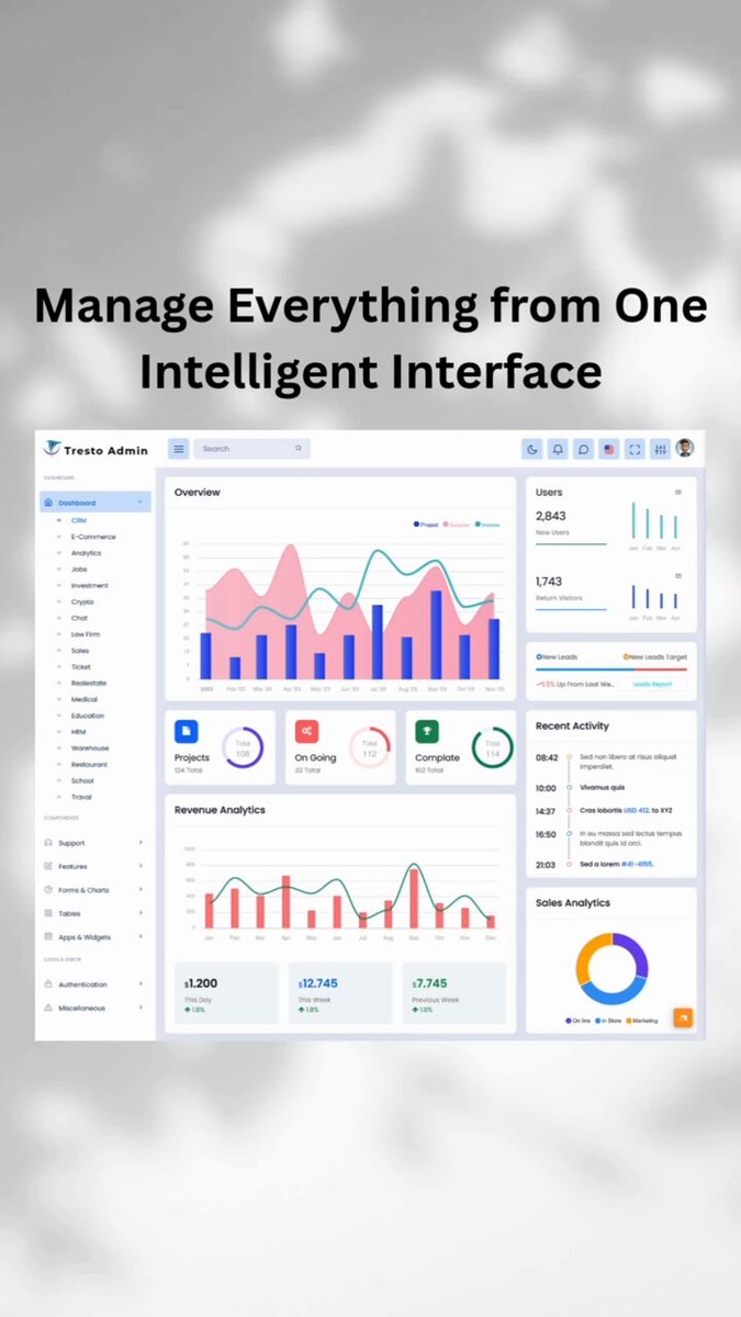 Bootstrap Admin Panels Template for Efficient Web Management 🖥️ . Buy Now: themeforest.net/item/tresto-bo… . #bootstrapadmin #adminpanel #webdesign #dashboardtemplate #responsiveui #webapps #frontend #uiuxdesign #webdevelopment #modernui #bootstraptemplate #datavisualization