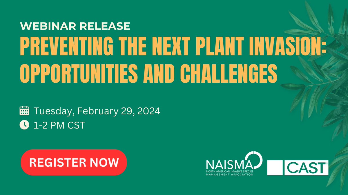 🌿Don't Miss Out!🌿 Join us tomorrow, February 29, from 1–2 pm CST for the webinar release of "Preventing the Next Plant Invasion: Opportunities and Challenges" in collaboration with @NAISMAorg. Register now! tinyurl.com/CASTInvasivePl… #CASTPaper #CASTWebinar #InvasiveSpecies