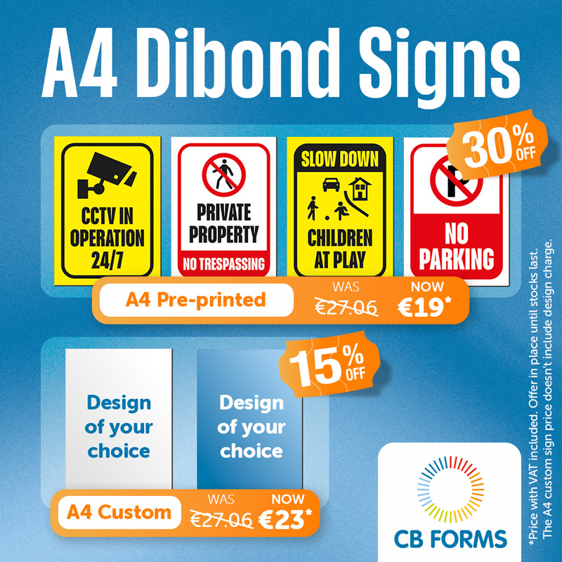 ๐ชง A4 Dibond Signs Sale โข Pre-printed โ 30% OFF โข Custom โ 15% OFF Durable indoor & outdoor signage โ while stocks last. ๐ Contact us today cbforms.ie/contact/ #Signage #Dibond #CBForms #Ireland
