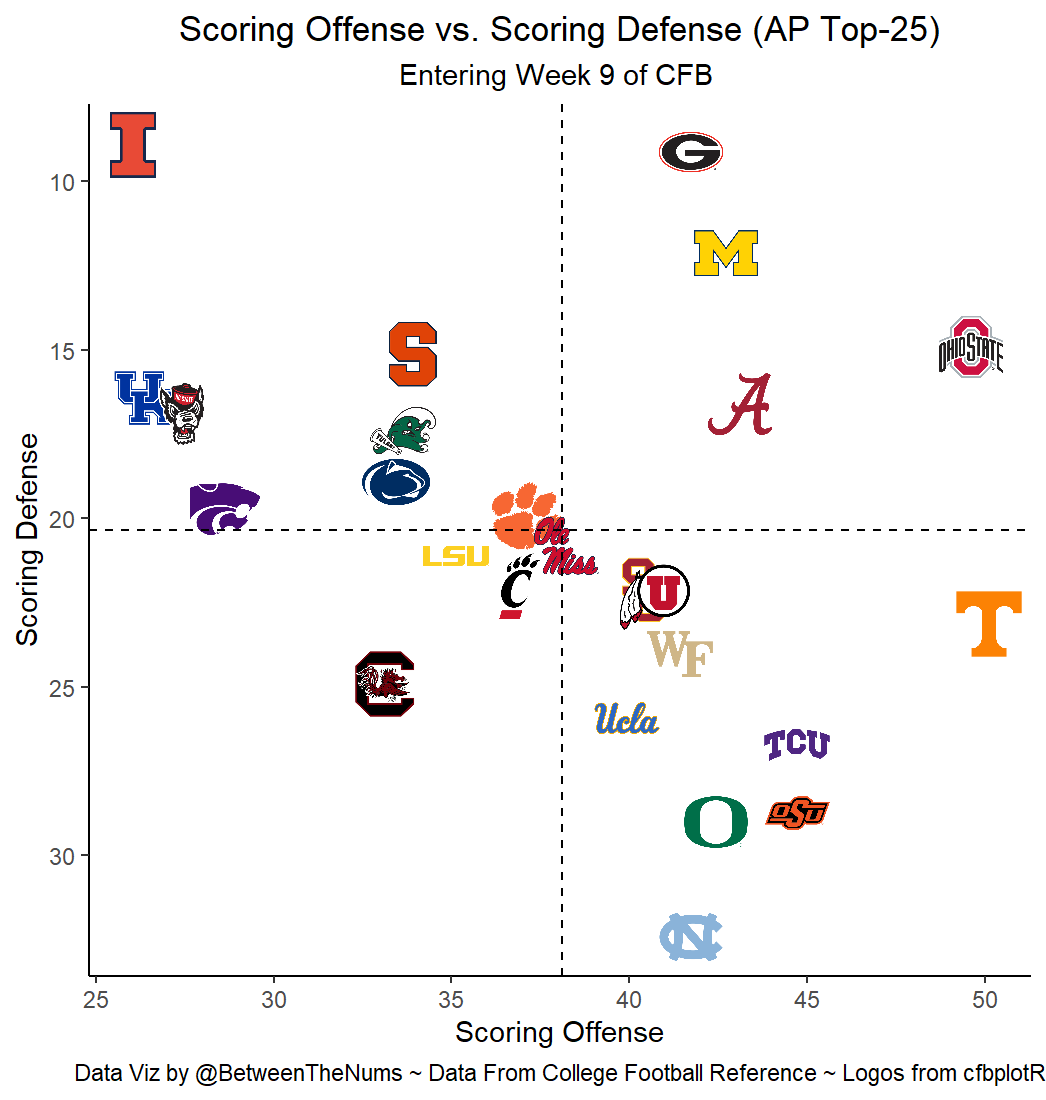 Entering tonight, here is where the current Top-25 FBS teams stand in terms of both Scoring Offense & Scoring Defense. Georgia, Michigan, Ohio State, & Alabama are in the powerhouse quadrant (Top Offense & Defense)!! Any surprises this season? #CFBData🏈
