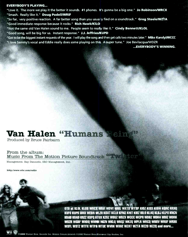 #OnThisDay in 1996, #VanHalen's contribution to the "Twister" soundtrack "Humans Being" was exploding at rock radio and on MTV. It debuted at #18 on the Hard Report's COR top fifty chart April 26th 1996. #ClassicRock