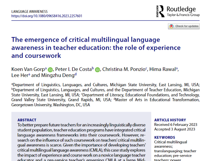 Case study research recounts the critical multilingual language awareness (CMLA) journeys of a novice teacher educator and a pre-service teacher. Coursework and personal experiences combined to facilitate #CMLA growth in #LinguisticallyDiverse classrooms. Abs. = Mandarin