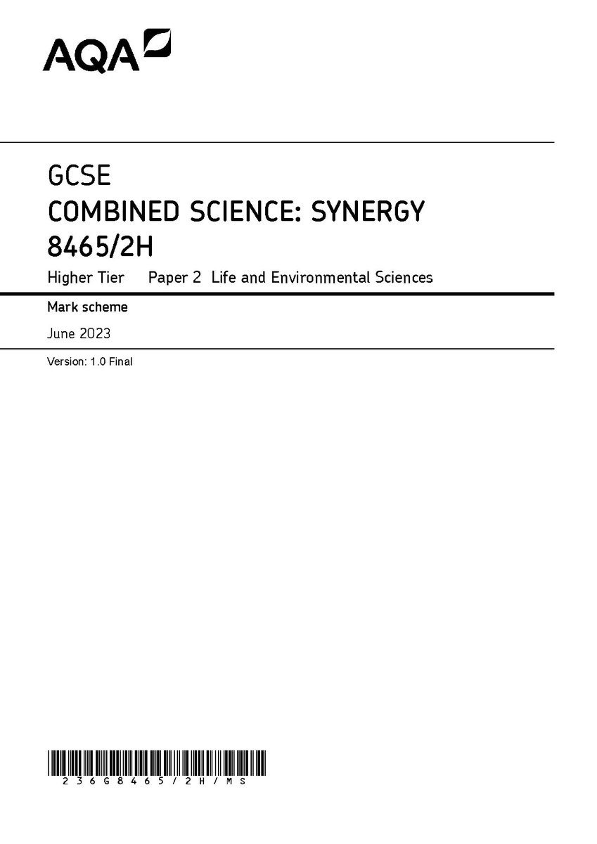 AQA GCSE COMBINED SCIENCE SYNERGY PAPER 2 MARK SCHEME (8465/2H: Higher Tier- Life and Environmental Sciences) #AQAGCSE #combinedscience #synergy #paper2 #markscheme #8465/2H #highertier #fliwy fliwy.com/item/379170/aq…